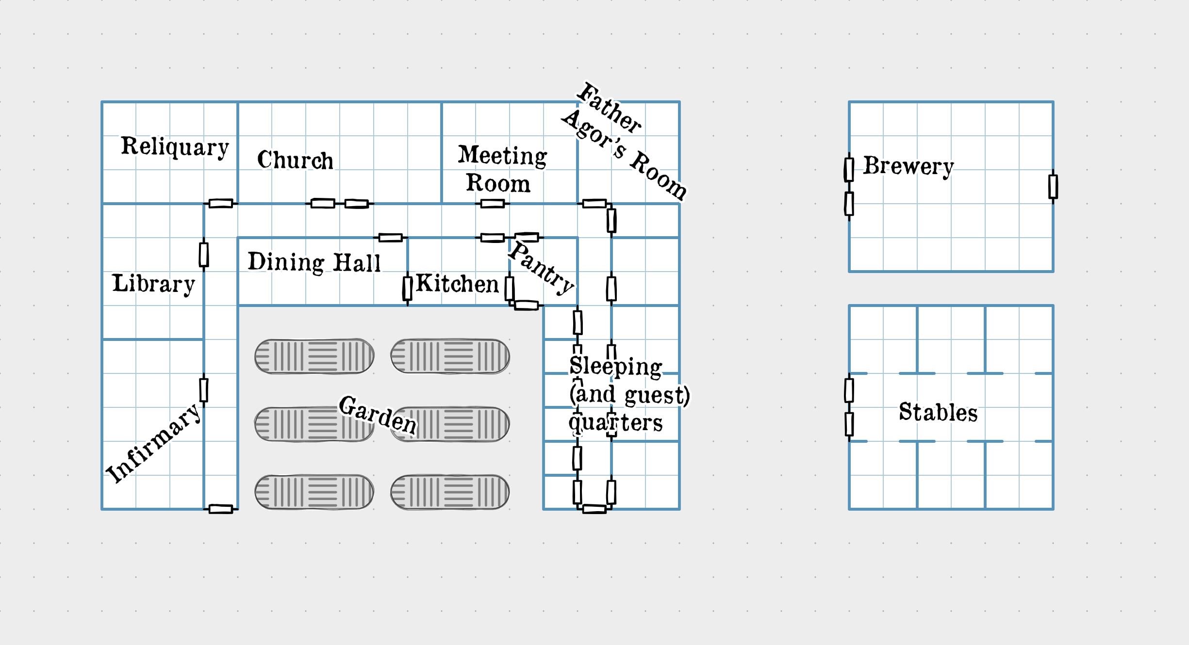 Traditionally, in old school adventures, there’s the dungeon and there’s the town. In the one I’m currently working on (untitled), the Monastery takes the place of the safe bastion. It’s a source of info, potential help, and rest.
