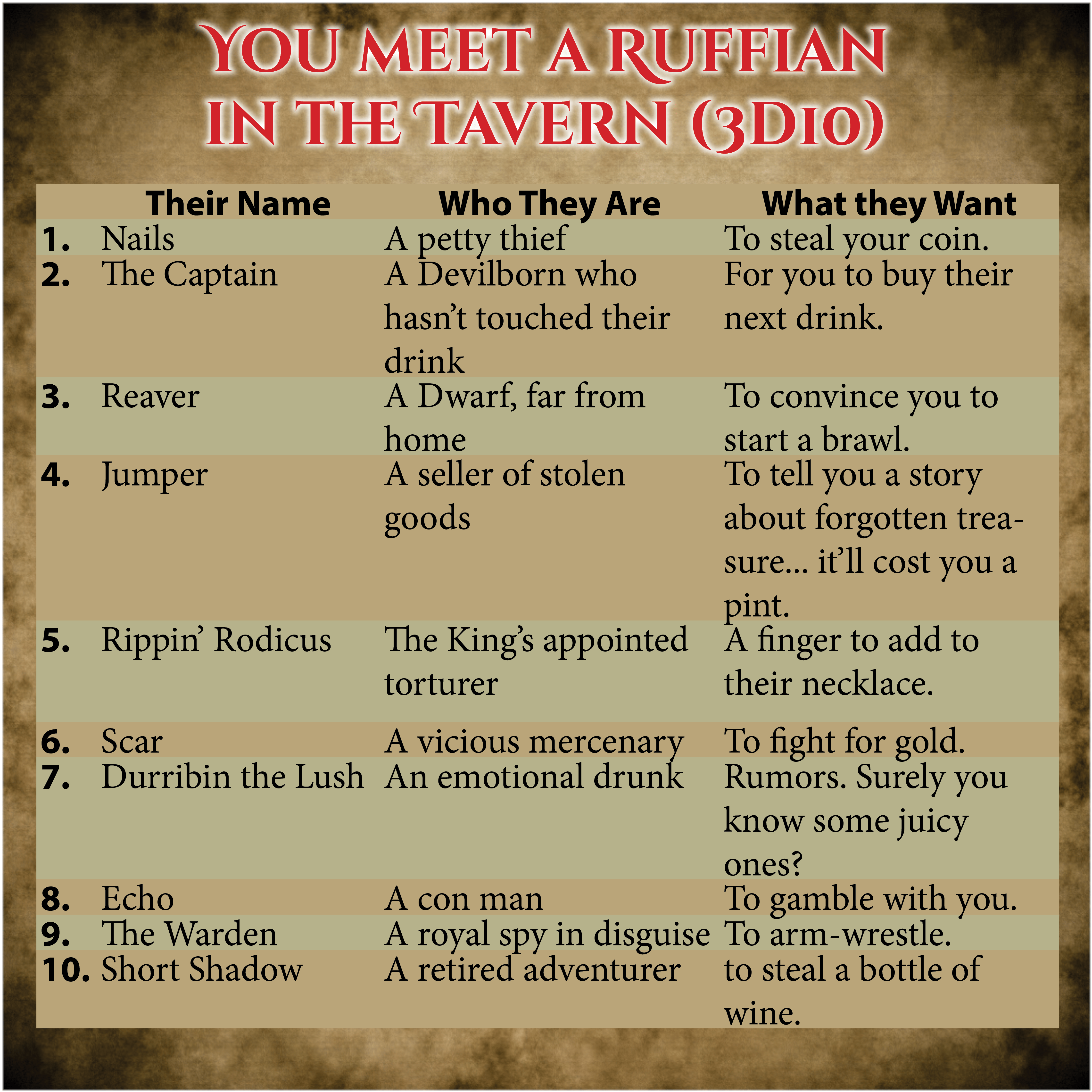 Grab 3d10 and figure out who that ruffian is. Is it Scar, a seller of stolen goods who wants you to buy their next drink? Or Reaver, the king’s appointed torturer who’s trying to steal a bottle of wine?
